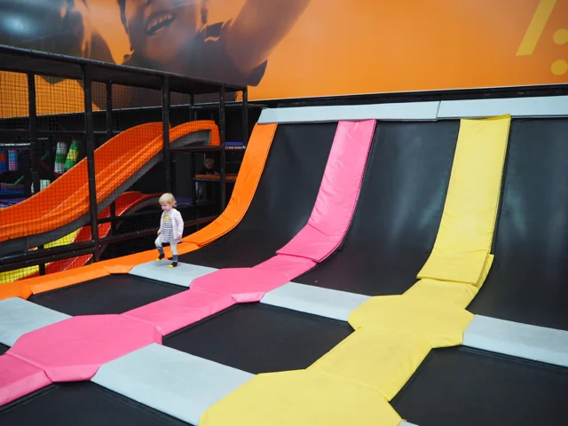 With their grip socks on we entered the Kids Zone which comprises of three areas: an adventure playground, trampolines and climbing wall. Arlo and Macy headed into the fully padded playground first and began to explore the impressive, multi-level structure. With a soft obstacle maze, six slides, two coloured ball pits, tunnels, climbing structures, ramps and stairs, this playground has every conceivable piece of play equipment guaranteed to tire out your active toddler! Add in a killer playlist of tunes (I caught Daddy singing on more than one occasion!) and it was clear to see that Latitude is fun for the whole family!