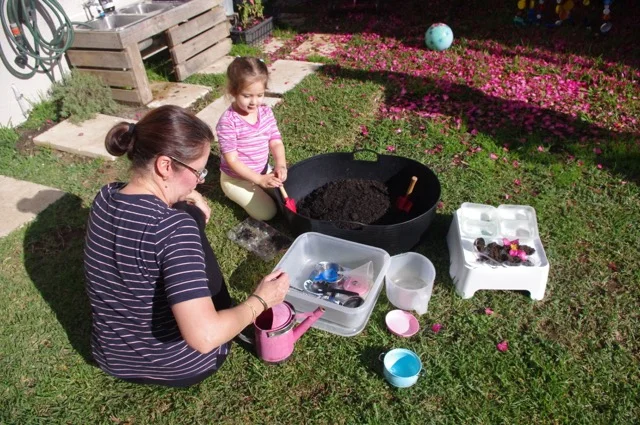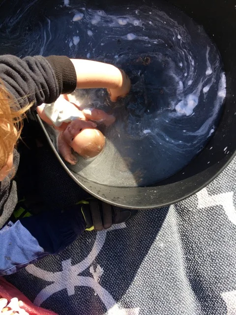 The mud pie station was a huge hit with the kids yesterday and little Mister really got soaked head to toe playing with the dirt and water and was happy to fill up his water jug and walk to the dirt tub until we had to go and he wasn’t a happy boy!