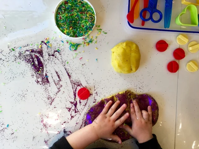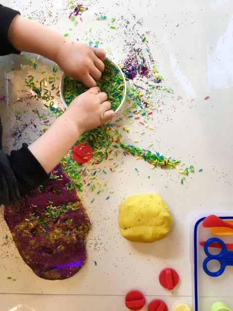 After some messy play we ventured in the studio to create some glittery and colourful playdough homemade by Liz. Little Mister practiced his fine motor skills spreading glitter, rice and using some stamps on the playdough.