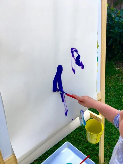 After some playdough fun, I followed little Mister outside and watch him play with some magic cornflour, paint on an easel and play with dirt of course! All those things that he loves watching his big sister do at preschool but never gets to do.