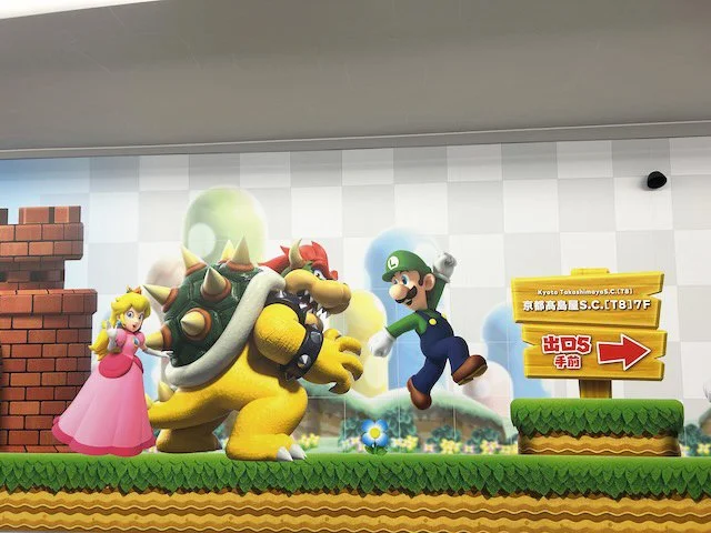 The Nintendo Kyoto store is located within the new T8 Building - Kyoto Takashimaya Shopping Center, more precisely on the 7th floor. But before we headed there, we noticed a few cool things along the way. When walking in the underground from the station to the store, we noticed some cool Nintendo wallpaper with retro Mario games on one side and new Mario games on the other with a few Pikmin in the mix and a sign pointing to the store - Mario original music was also playing which was pretty fun.