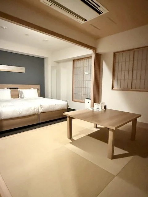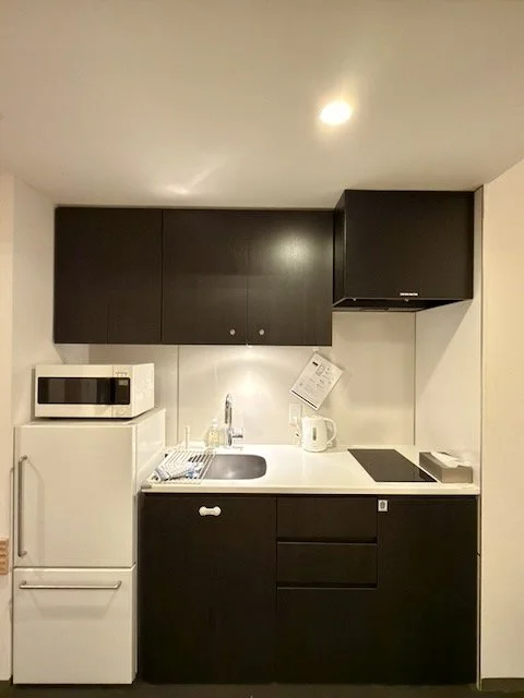 The room included a compact kitchenette with the standard Mimaru fridge, basic kitchen appliances, and dishware, along with an air purifier and air conditioning in the ceiling. There was only one chair in the room. The futon area doubled as a small dining space when the beds weren’t laid out.
