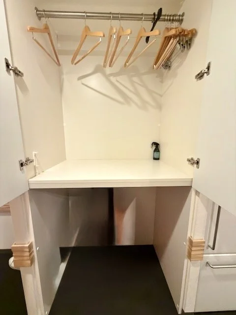 Storage cupboard with area for suitcases under next to kitchen - Photo @busycitykids