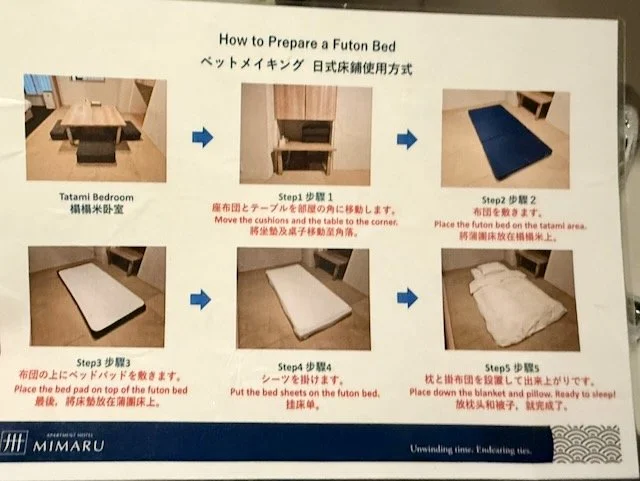 The only room available at the time was a Japanese Apartment with 2 twin beds and 2 twin futons. It was a pleasant space and the staff were lovely, but for adults, the futons can be quite uncomfortable over longer stays. The twin beds mattresses' were firm and the pillows provided varied from soft to a bit firmer. We also found that once the futons were laid out, there was very little room left to eat or move around during the day. If we’d had the choice, we would have opted for a room with four twin beds instead.