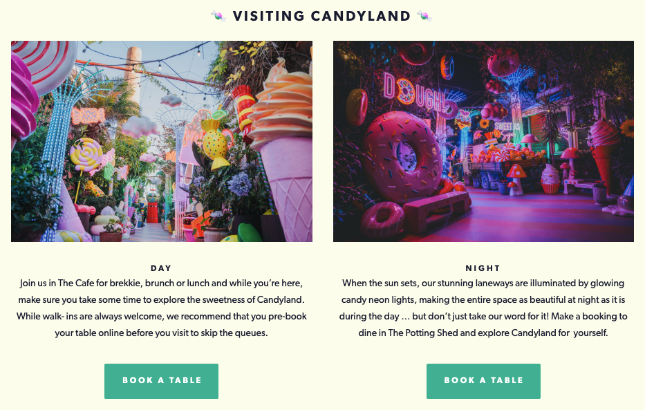 Please be aware that the Candyland installation is strictly reserved for customers of The Grounds. Book your table in The Cafe or The Potting Shed.